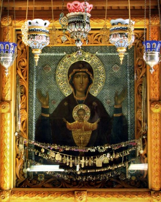 Что изображает эта икона? По иконографии она относится к типу одного из древнейших изображений Божией Матери - "Оранта", только Богомладенец написан стоящим в чаше. Чаша с благословляющим Богомладенцем - это чаша Причащения, источающая приступающим к нем с верою все благословения, дарованные грешному роду человеческому искупительным подвигом Господа нашего Иисуса Христа. Эта чаша действительно Неупиваемая, или